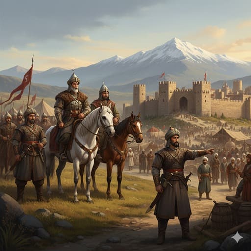 [Gambar Prompt 2: Ilustrasi sejarah yang menggambarkan Osman I dan Orhan Gazi mendirikan negara Ottoman awal di Bursa, menunjukkan transformasi dari beylik kecil menjadi fondasi kekaisaran besar]