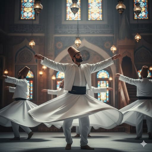 Gambar 3. Ritual Sema Dervish yang Memukau : Penari Dervish yang memukau sedang melakukan ritual Sema di sebuah situs bersejarah, dengan pencahayaan yang lembut dan eterik. Fokus pada jubah putih mereka yang mengalir dan intensitas spiritual gerakan mereka.