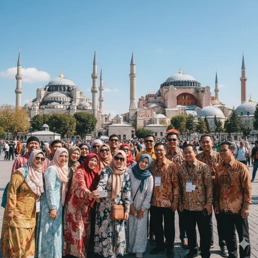 Gambar 4. Kegembiraan Peziarah Indonesia di Istanbul : Sekelompok peziarah Indonesia, berpakaian sopan, tersenyum dan berfoto bersama di depan landmark bersejarah di Istanbul, dengan langit biru cerah.