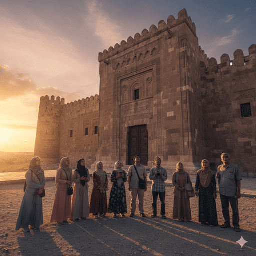 Gambar 5. Sekelompok jamaah Indonesia, mengenakan pakaian sederhana, berdiri kagum di depan Karavanserai Sultanhanı, menyaksikan skala besar dan signifikansi sejarahnya. Matahari terbenam, menciptakan bayangan panjang.