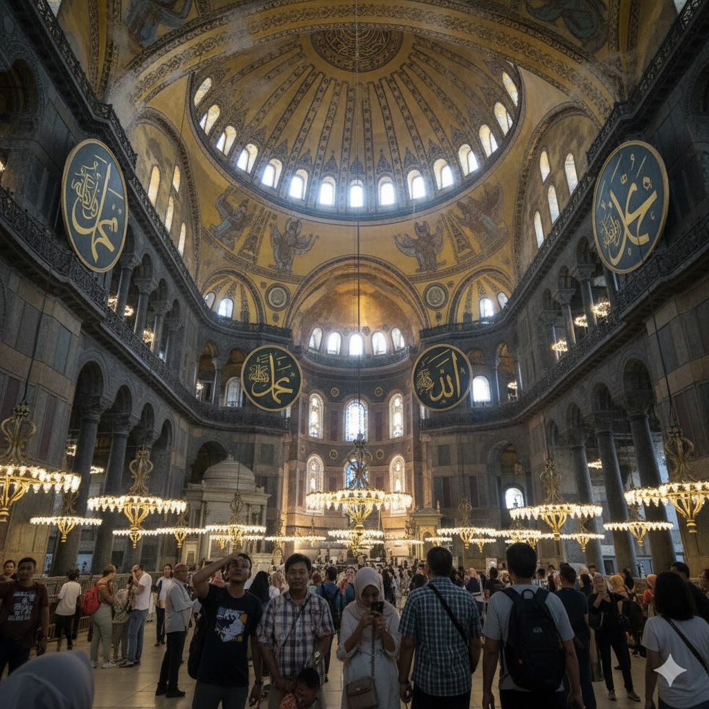 Ketika Anda memasuki Hagia Sophia, Anda akan terpukau oleh kubahnya yang menjulang tinggi, mozaik-mozaik Bizantium yang masih tersisa, dan kaligrafi Islam yang indah. Perpaduan unsur Kristen dan Islam di dalamnya menciptakan suasana yang khusyuk dan penuh makna. Ini adalah tempat di mana Anda bisa merasakan denyut sejarah dan keagungan masa lalu.