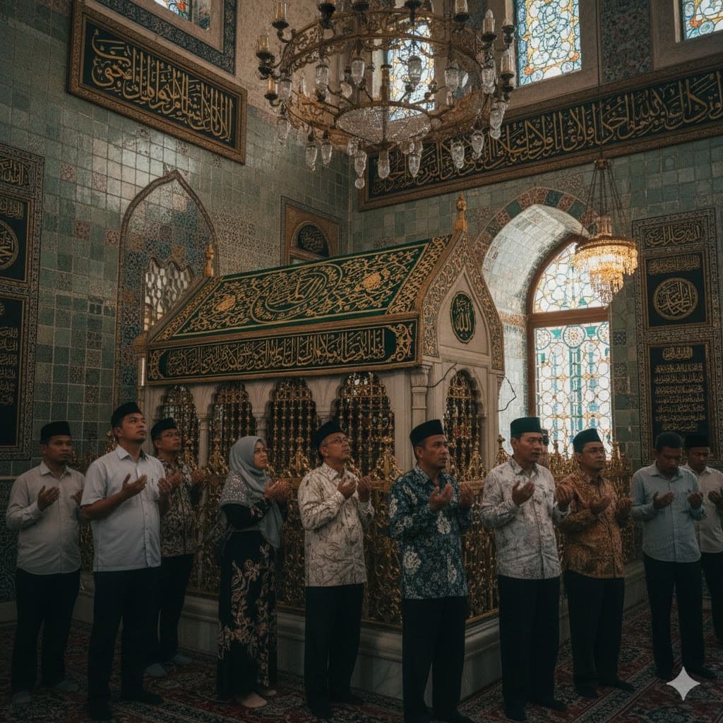 Gambar 4: Para peziarah berkumpul dengan penuh hormat di sekitar makam Abu Ayyub al-Ansari di dalam kompleks Masjid Sultan Eyup, dengan suasana spiritual dan damai. Pencahayaan yang lembut dan khidmat. Tanpa teks.