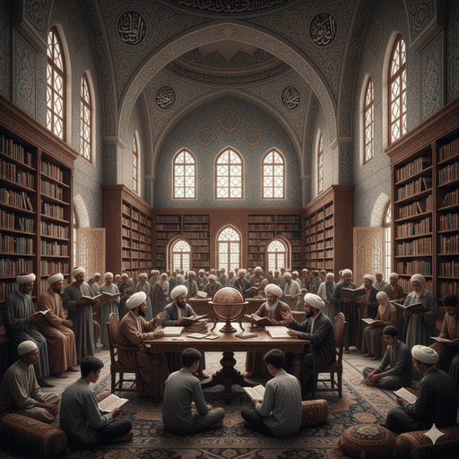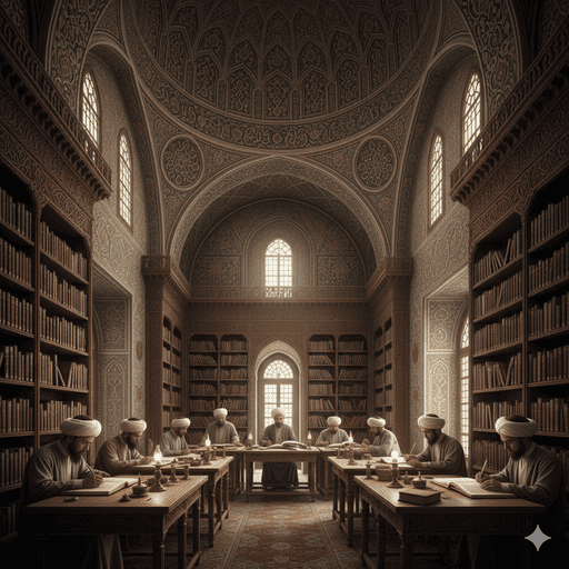 Gambar 1. Interior perpustakaan Ottoman yang megah dan kaya ornamen, dengan langit-langit tinggi, keramik berukir indah, dan deretan manuskrip kuno di rak-rak kayu. Para cendekiawan terlihat tekun belajar dan menyalin teks.