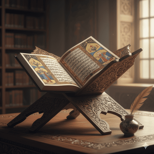 Gambar 2. Tampilan close-up manuskrip Ottoman yang indah, terbuka di mimbar kayu, dengan kaligrafi rumit dan lukisan miniatur. penerangan yang lembut dan hangat.