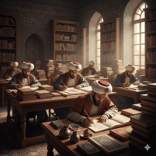 Gambar 3. Adegan yang menggambarkan para juru tulis dan kaligrafer Ottoman dengan teliti mengerjakan penyalinan dan penghiasan manuskrip dalam pengaturan perpustakaan yang terang, dikelilingi oleh tumpukan buku.