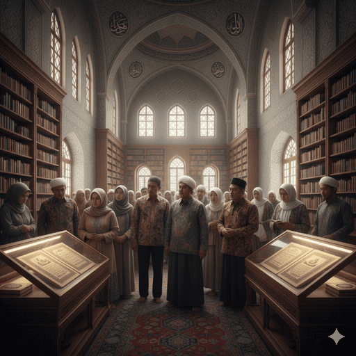 Gambar 5. Sekelompok jemaah haji Indonesia, mengenakan pakaian sederhana, berdiri di Perpustakaan Istana Topkapi, melihat manuskrip kuno yang dipajang dalam etalase kaca, dengan rasa takjub dan penuh hormat.